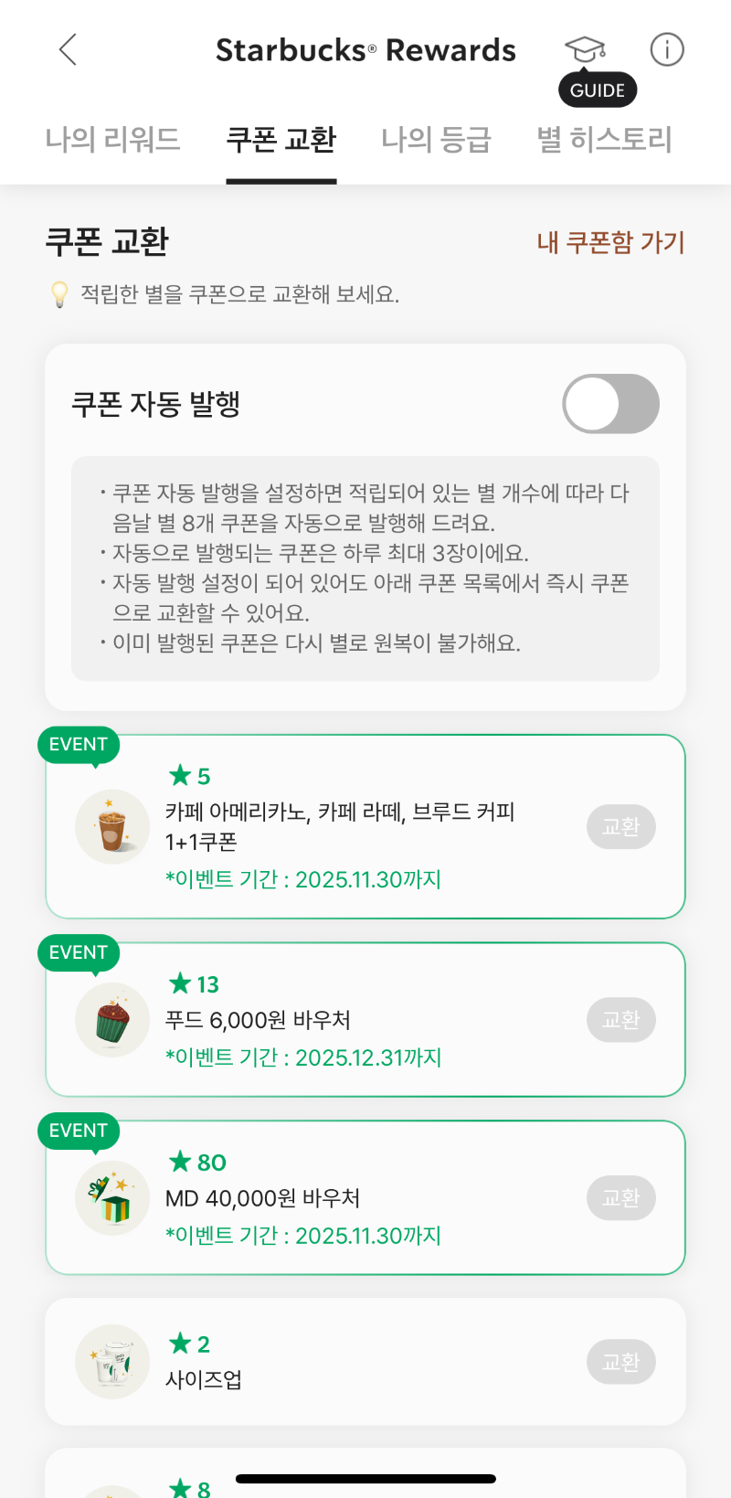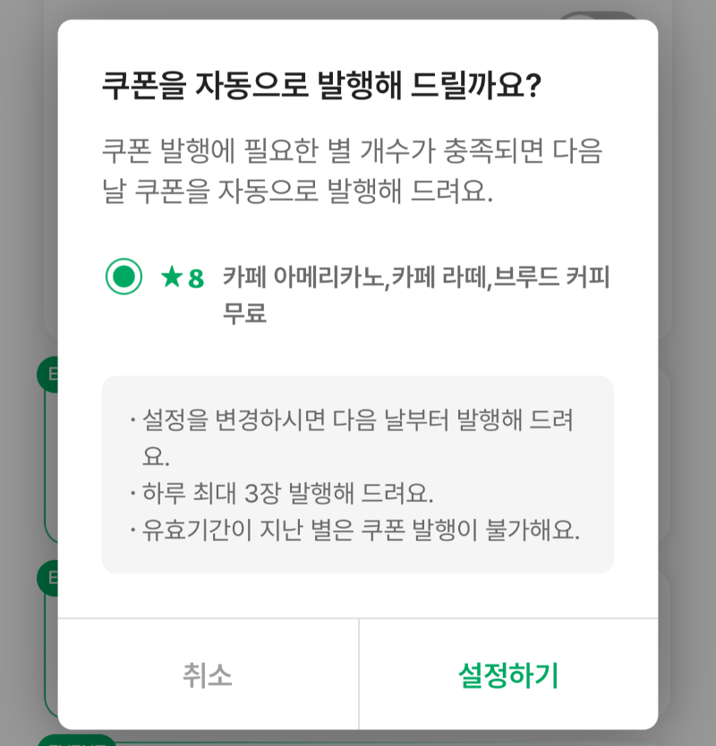- 8개짜리 '카페 아메리카노 / 카페 라떼 / 브루드 커피' 쿠폰으로 교환된다. 다른 쿠폰 자동 교환은 설정이 불가능하다.