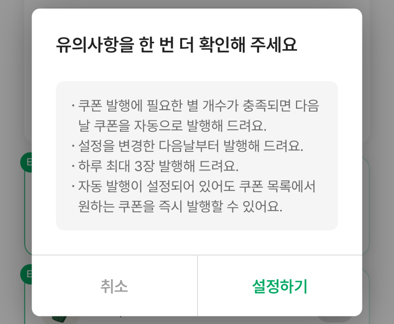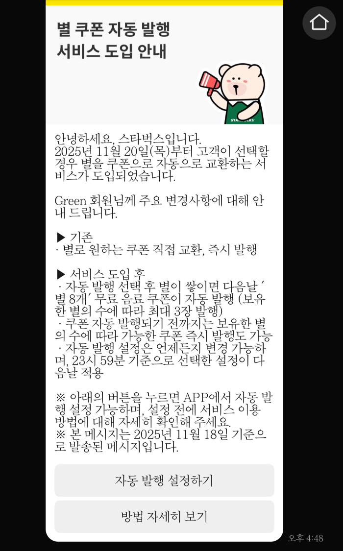 적립된 별을 쿠폰으로 자동발행해주는 서비스가 도입되었다고 한다.