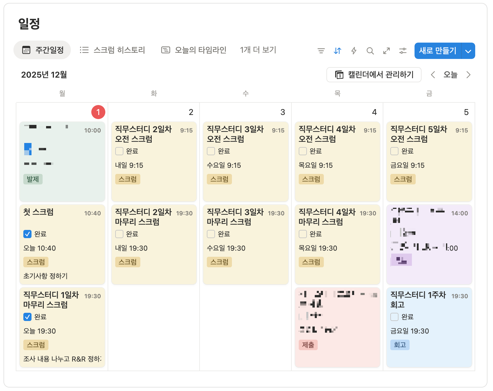 보드로 할까, 위클리 달력으로 할까, 타임라인으로 할까 고민하다가 처음으로 달력을 사용해봤다.