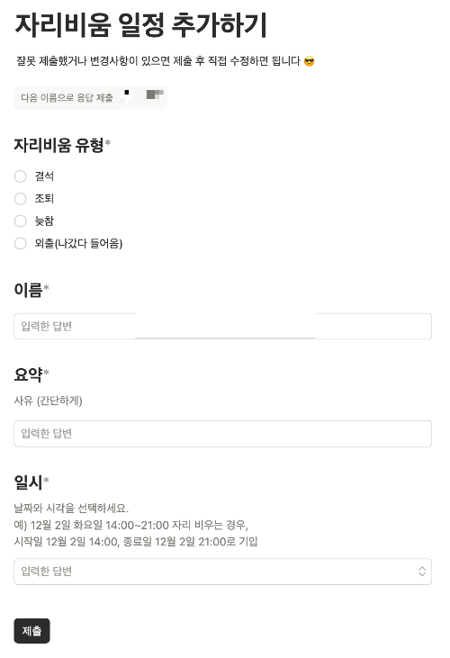 일정 테이블에 추가되고 '유형' 속성에서 자리비움이 선택되도록 하려고 했는데(템플릿처럼), 노션 폼에서는 구현이 어려웠다. 괜히 '유형' 속성에서 자리비움을 선택하는 번거로운 질문 하나를 추가해야 해서 사용자경험이 안 좋아지니...