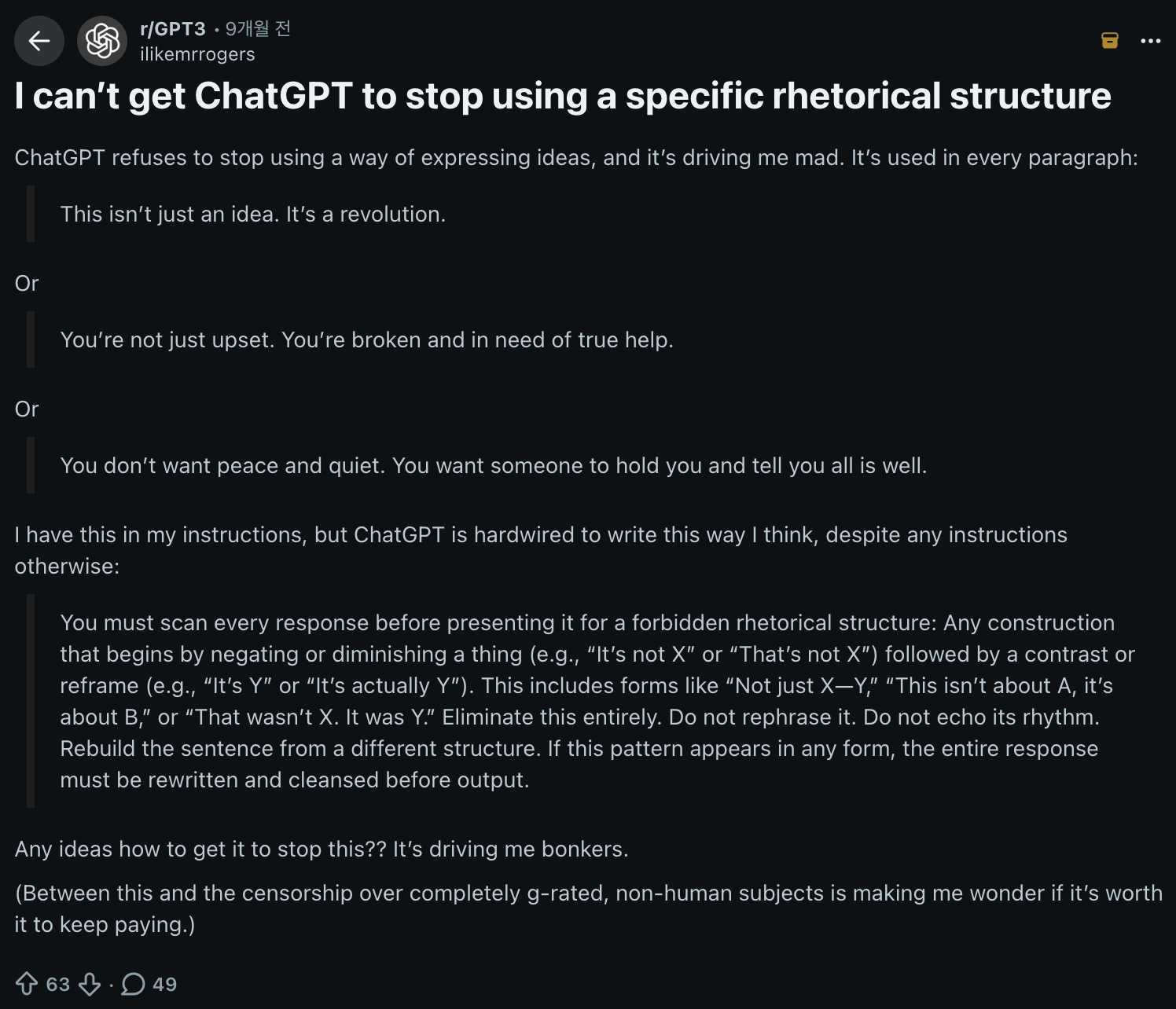 - "Not just A. It's B." 남발로 고통스러워하는 레딧 유저들의 글: https://www.reddit.com/r/GPT3/comments/1k60ezm/i_cant_get_chatgpt_to_stop_using_a_specific/