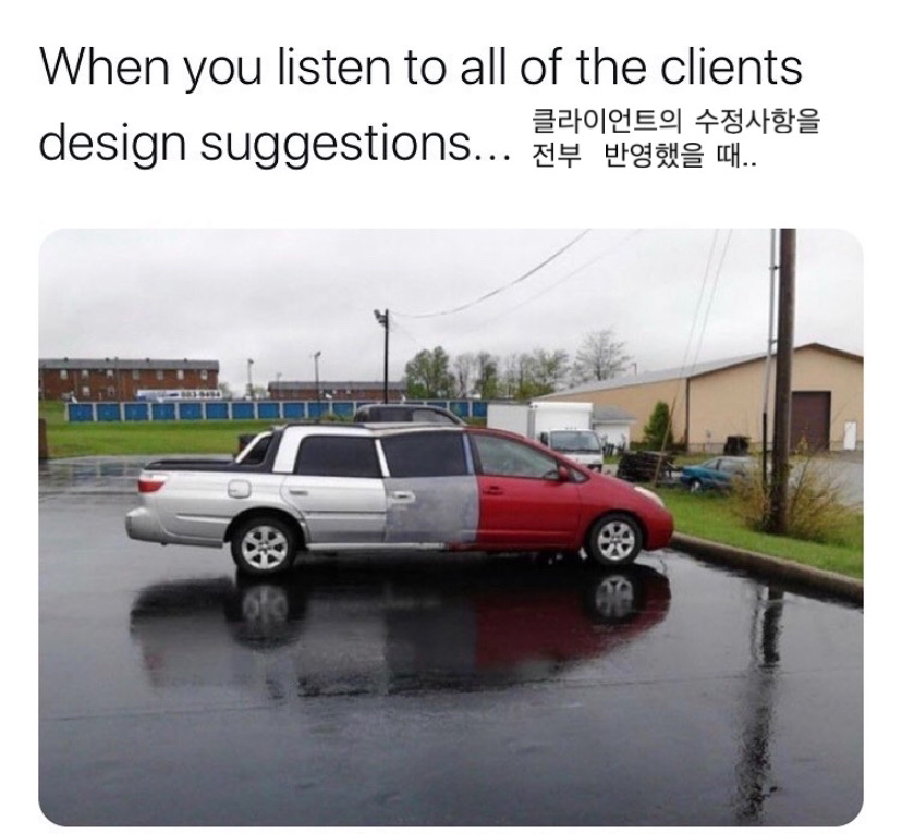 종합해보면 PM의 화법이라면 (<프로덕트 오너> 책에서는 PO의 화법으로 나온 내용이지만) "이 버튼은 파란색이어야 해요"가 아니라 "지금 유저들이 결제 단계에서 이탈하고 있는데, 인지 부하를 줄이기 위해 정보를 분산하는 방향은 어떨까요?"라고 말하는 것이 해당된다고 할 수 있다. 이쯤 되니, 대학생 때 디자인 외주 하면서 짜증났던 클라이언트의 전형만 피해도 괜찮은 PM이 될 수 있겠다는 생각이 드는데 취준생의 우스운 착각일까?
