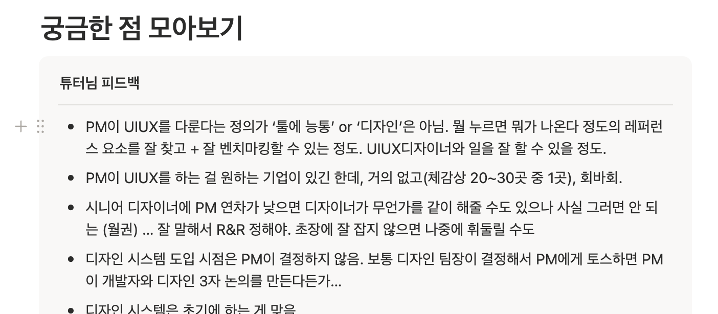 팀원들과 함께 비슷하게 궁금했던 부분 첫번째는 "PM이 디자인을 어디까지 알아야 하는가"였다. 튜터님은 PM이 피그마를 장인처럼 다루거나 직접 픽셀을 조정할 필요는 없고, 오히려 그런 기능적인 면보다 중요한 것은 ‘UI/UX 디자이너와 일을 잘할 수 있는 정도’의 감각을 갖추는 것이라고 답변해주셨다.