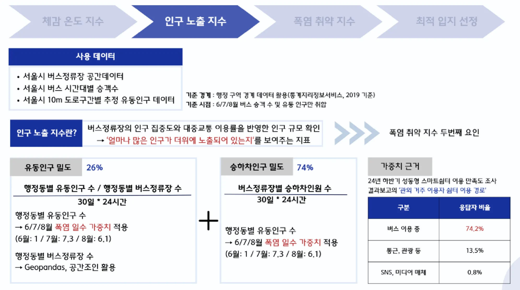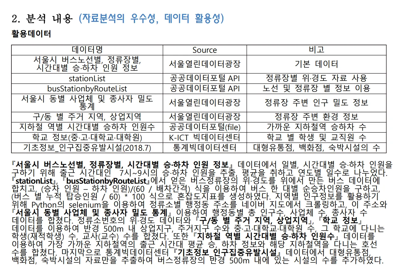아래 사례들을 보면 (서로 다른 수상작이다) 승하차 인원 데이터와 버스정류장 위치 데이터, 배차간격 데이터를 이용하여 버스 한 대당 순승차인원을 구했고, 행정동별 유동인구 수와 하계 폭염일수, 버스정류장별 승하차 인원 수, 도로구간별 유동인구 수를 조합하여 얼마나 많은 대중교통 이용 인구가 더위에 도출되어 있는지를 측정하였다.