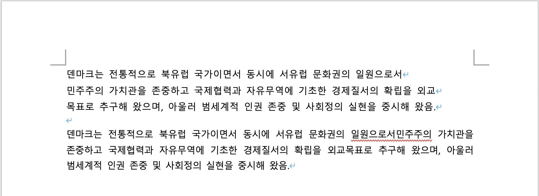 그 다음 워드에 붙여넣으면 아까와 달리 줄바꿈이 없어진 채로 붙여넣기된다.