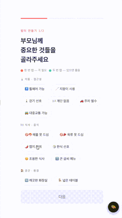 고민인 부분 2. 키워드 태그를 부모님/사용자에 물려야 할지, 장소에 물려야 할지 애매하고, (이를 하나로 통일하는 방향성으로 갈 것 같지만) 분리하면 MVP 범위가 갈라져서 뾰족해지지가 않았다. 이 부분도 여쭈어봤더니 설문조사 기반으로 뾰족하게 가고, 내일 오전 튜터님과 이야기 나누어 보라고 하셨다. 이 부분들만 잘 짚고 넘어가면 일사천리일 거라고 해주셨다. 오예!